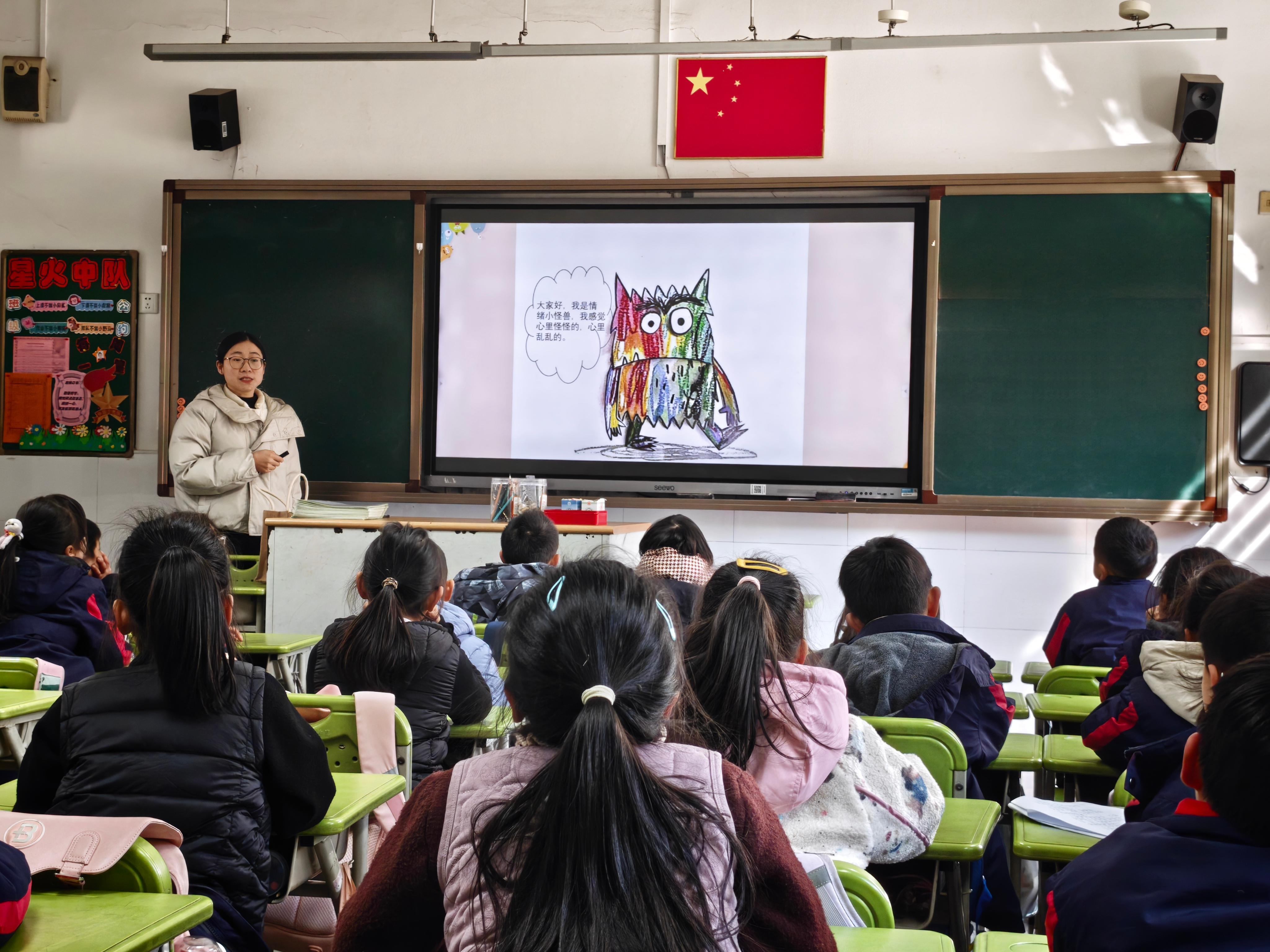 一(5)班卢意晨妈妈则聚焦于儿童心理成长,开设了情绪认知课程《我的情绪小怪兽》。她以经典绘本为载体,通过播放欢快与舒缓的对比音乐,引导学生们初步体会情绪的存在。课堂核心环节,她运用鲜明的色彩隐喻,将快乐、伤心、生气、害怕、平静五种基本情绪具象化为不同颜色的小怪兽,配合生动的描述和情景模拟,让学生们直观理解各种情绪的表现与感受。课程还设置了“情绪表演猜猜看”和“我的情绪星期表”等互动环节,鼓励学生识别并表达自我情绪。最后,通过设计生活场景挑战,她教会学生们运用深呼吸、倾诉、转移注意力等简单实用的方法来管理情绪,助力他们迈出成为“情绪小主人”的第一步。